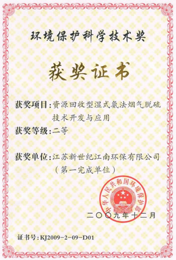 獲得國(guó)家科技部獎(jiǎng)項(xiàng):由公司獨(dú)立完成的自主知識(shí)產(chǎn)權(quán)的“資源回收型濕式氨法脫硫技術(shù)開發(fā)與應(yīng)用”榮獲國(guó)家環(huán)保科技獎(jiǎng)二等獎(jiǎng)。