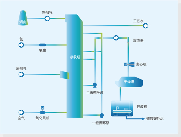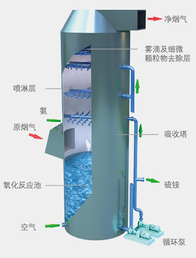 煤、石油中含有一定含量的硫,高溫燃燒后產生硫氧化物(SO2和SO3),對大氣環境造成嚴重污染,江南氨法脫硫技術以NH3和SO2反應為基礎,在多功能煙氣脫硫吸收塔中,氨將煙氣中的SO2吸收得到脫硫中間產品亞硫酸(氫)銨的溶液,鼓入空氣,將亞硫酸(氫)銨直接氧化成硫酸銨。